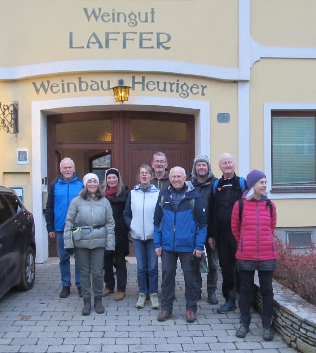 Am Sonntag den 14. Dezember fuhren wir diesmal mit der Schnellbahn nach Thallern. Am Beethovenweg ging unsere Tour vorbei am Richardhof nach Pfaffstätten. Schöne Wege durch den Wald oder auch manchmal vorbei an Weingärten führten uns zum Ziel. Schließlich kamen wir nach Pfaffstätten, wo wir bei einem schon bewährten Heurigen unsere Einkehr machten. Das trübe, nebelige Wetter konnte unserer Stimmung nichts anhaben, denn wir (10 Wanderbegeisterte) fanden die Wanderung schön!